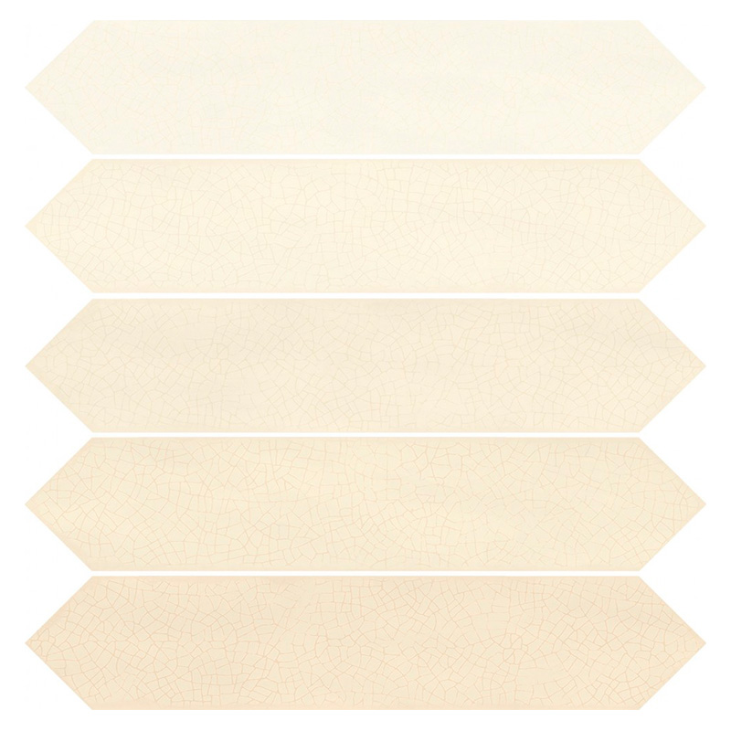 CRACKLE MARFIL, un azulejo de pequeño formato en forma de flecha de dos puntas, una original propuesta con piezas muy destonificadas en una suave paleta de tonos pastel. Gracias a la decoración digital, se reproduce fielmente el aspecto cuarteado de la cerámica antigua pero con una protección total contra las manchas.
