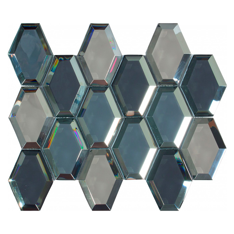 SUMMUM, es un mosaico 3D de cristal, efecto diamante con un diseño sobrio y elegante, las teselas de esta malla tienen forma de rombo diamantado, gracias a su bisel interior plateado, que produce un efecto óptico muy interesante al potenciar los juegos de luz y sombra. Combínalo con cualquier azulejo liso o con diseño de mármol y  realza tu estancia, aportando un toque de distinción.